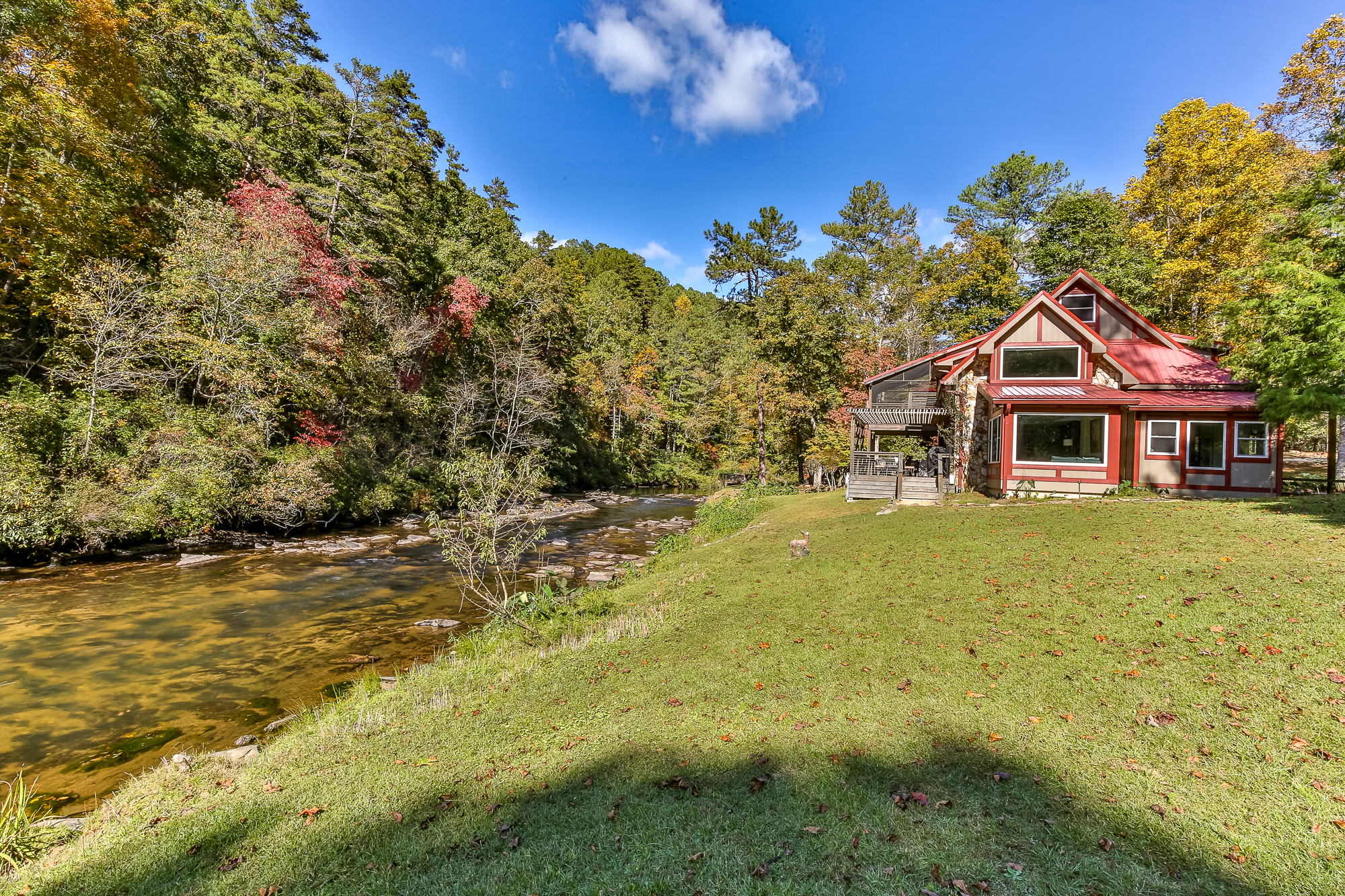 Riverfront Ellijay cabin rental with private hot tub, three king Master Suites, and game room — perfect for romantic getaways or family escapes with mountain views and wildlife.